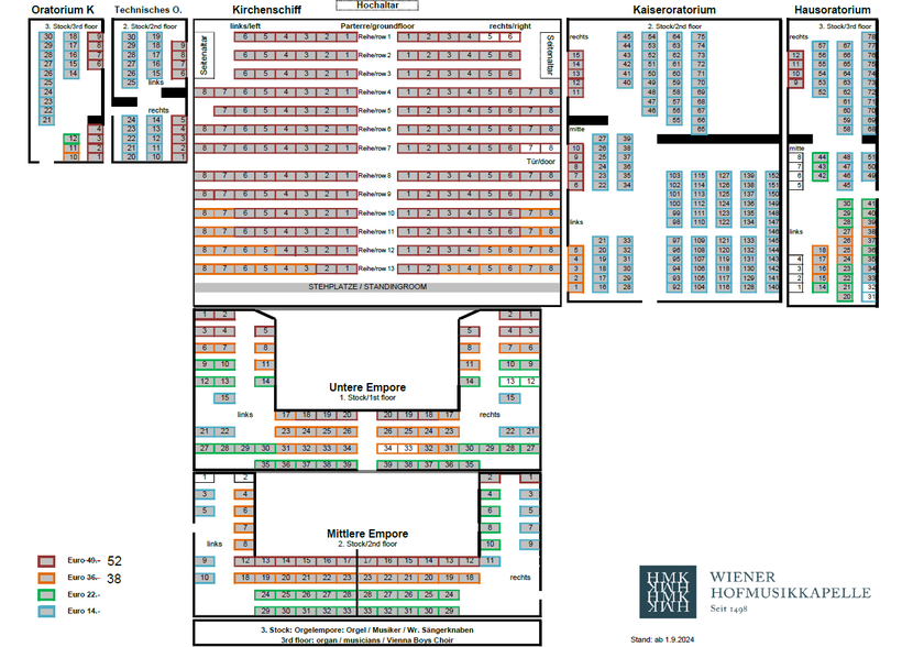 その下のKirchenschiffが1階の主祭壇が正面に見られる赤く塗られた空間で、52ユーロのカテゴリーの多くはこのエリアです。
